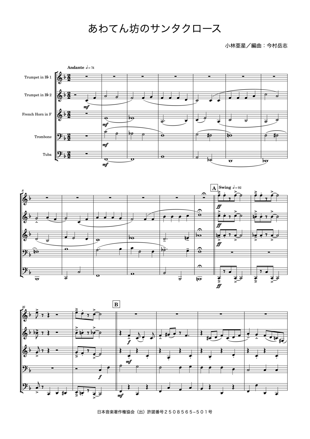 『あわてん坊のサンタクロース』金管五重奏は、穏やかな雰囲気から始まり、ジャズのテイストでノリよく締めくくられるアレンジです。クリスマスの楽しさがより一層盛り上がること間違いなしです!金管楽器ならではのジャジーなテイストが、音楽ををより活き活きとさせてくれます!